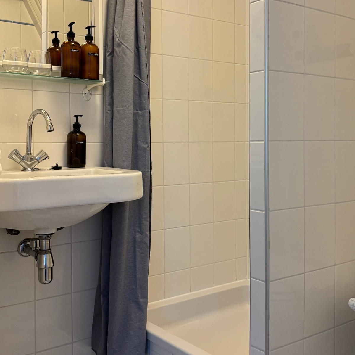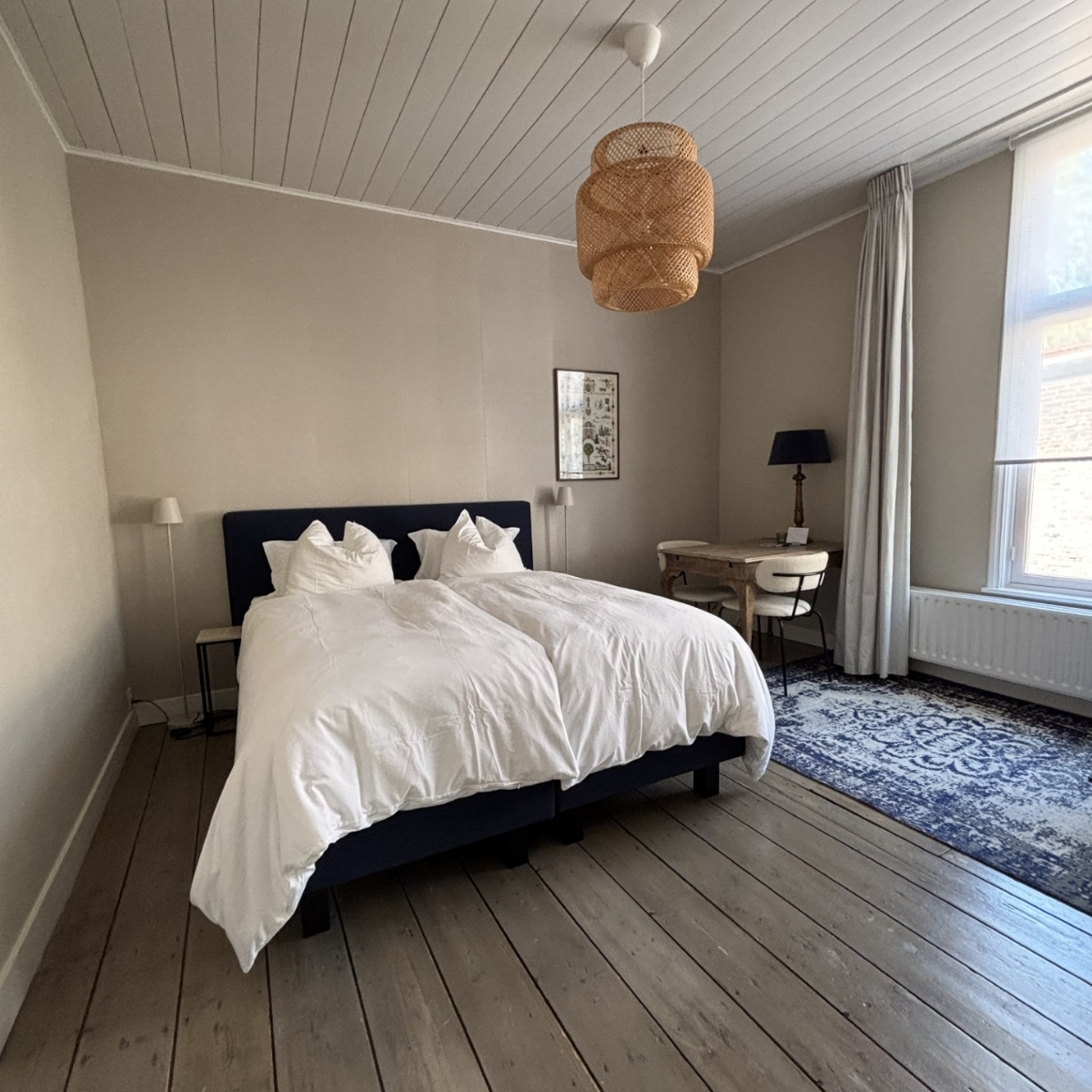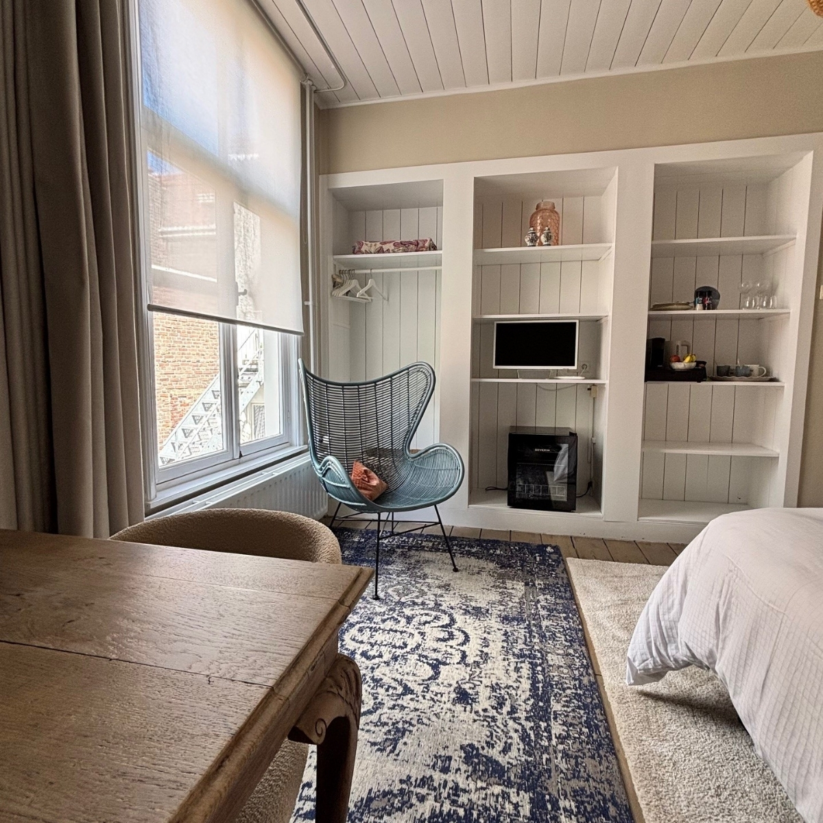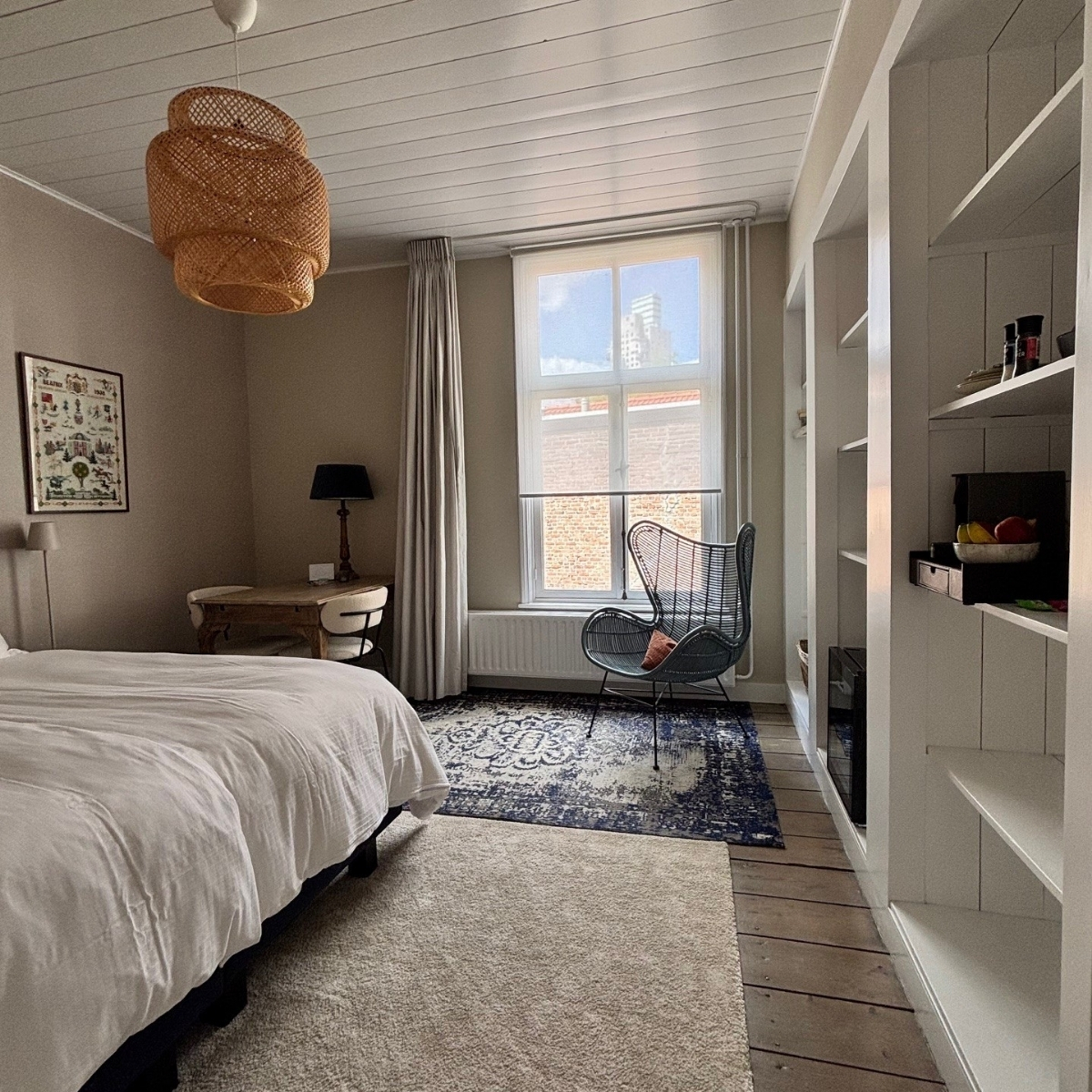 In de badkamer vind je een echte eyecatcher: een vrijstaand bad op pootjes, perfect voor een ontspannen moment na een dag in de stad. Een fijne zitplek, een groot bed met fris wit linnengoed en een rustige sfeer maken deze kamer ideaal voor een romantisch verblijf of een luxe nachtje weg.