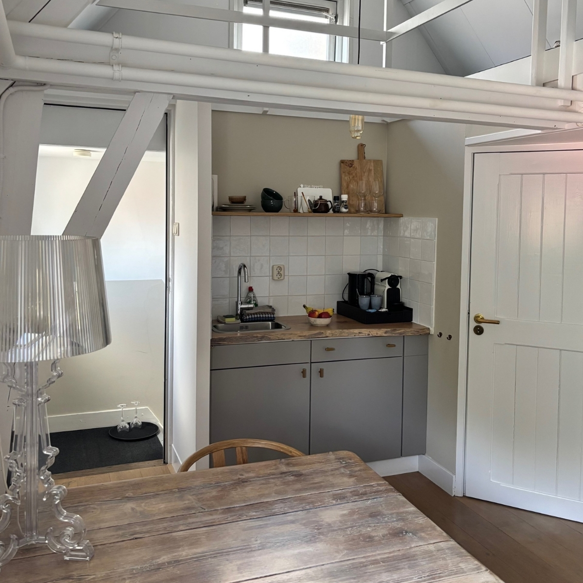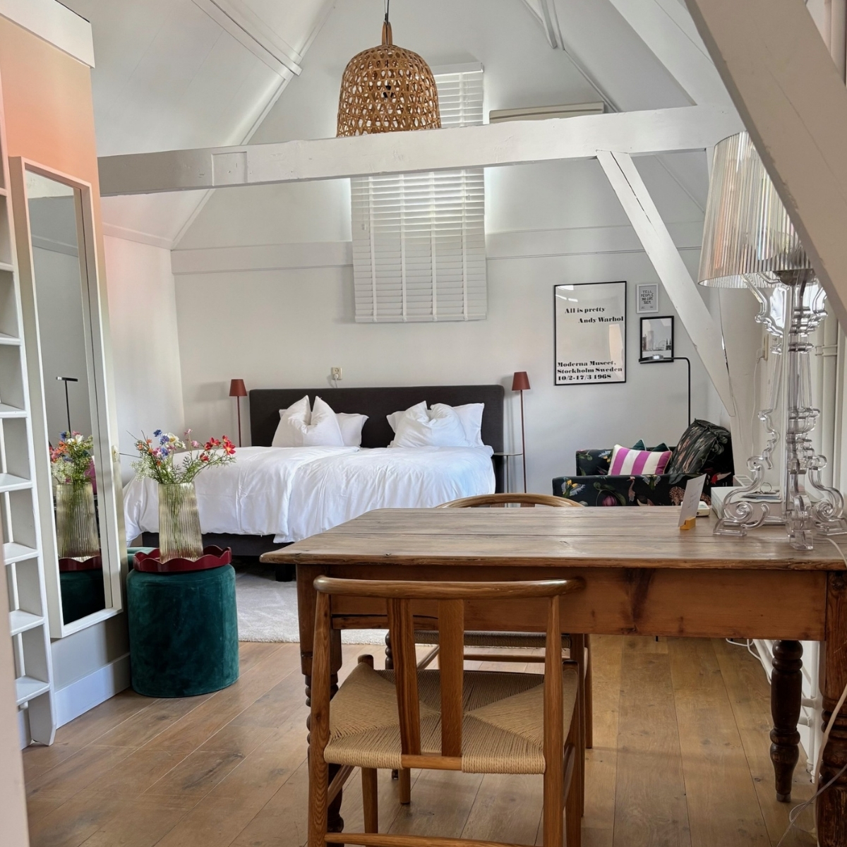 Onze Studio bevindt zich op de bovenste verdieping van het herenhuis, onder de charmante houten balken en met een indrukwekkend hoog plafond. De ruimte voelt luchtig en modern, met een mix van vintage meubels, kunstzinnige details en een warme eikenhouten vloer.
